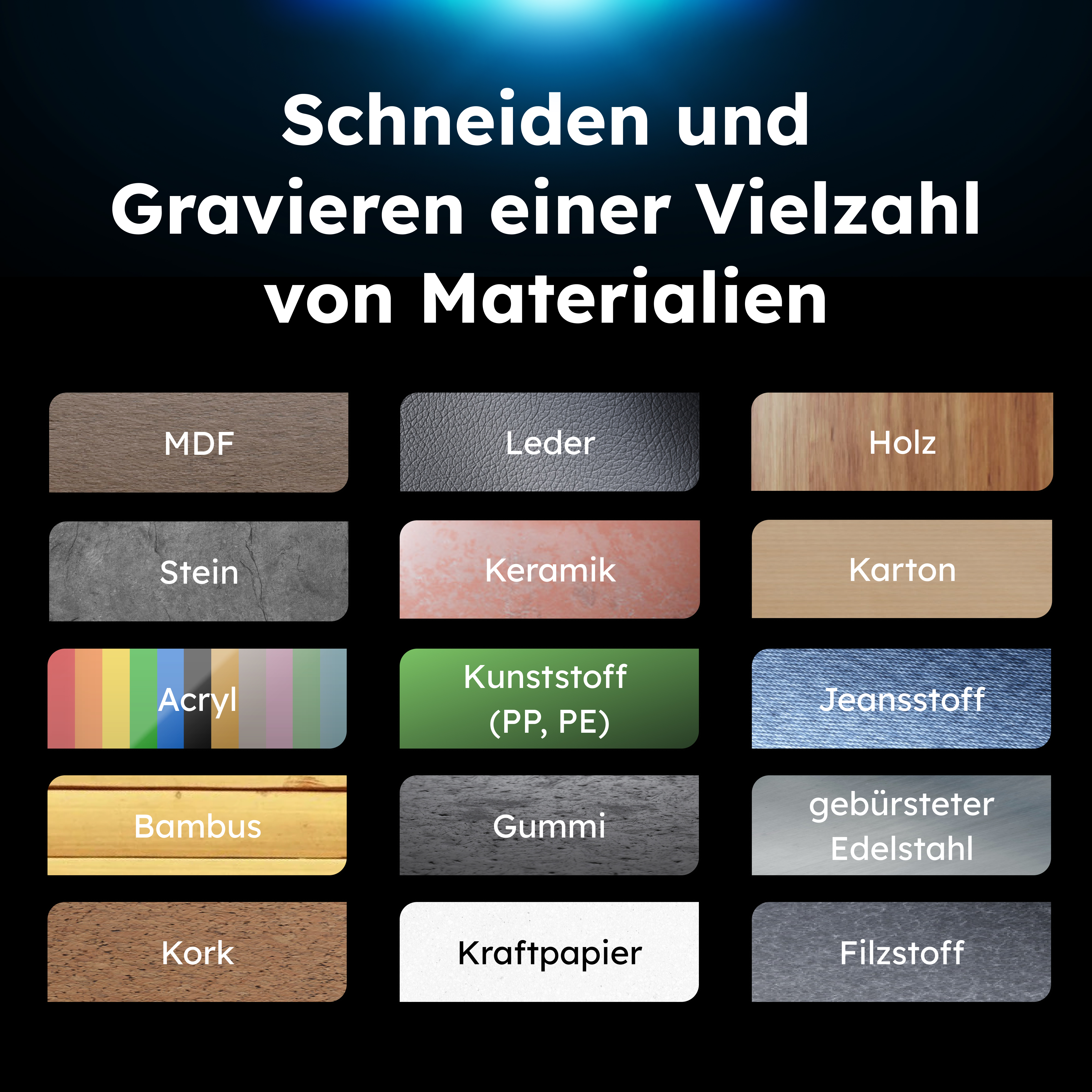 Geeignet für Holz, Acryl, Leder und Kunststoffe sowie für präzise Gravuren und saubere Schneidarbeiten in unterschiedlichsten Projekten – von Einzelstücken bis zur Serienfertigung.