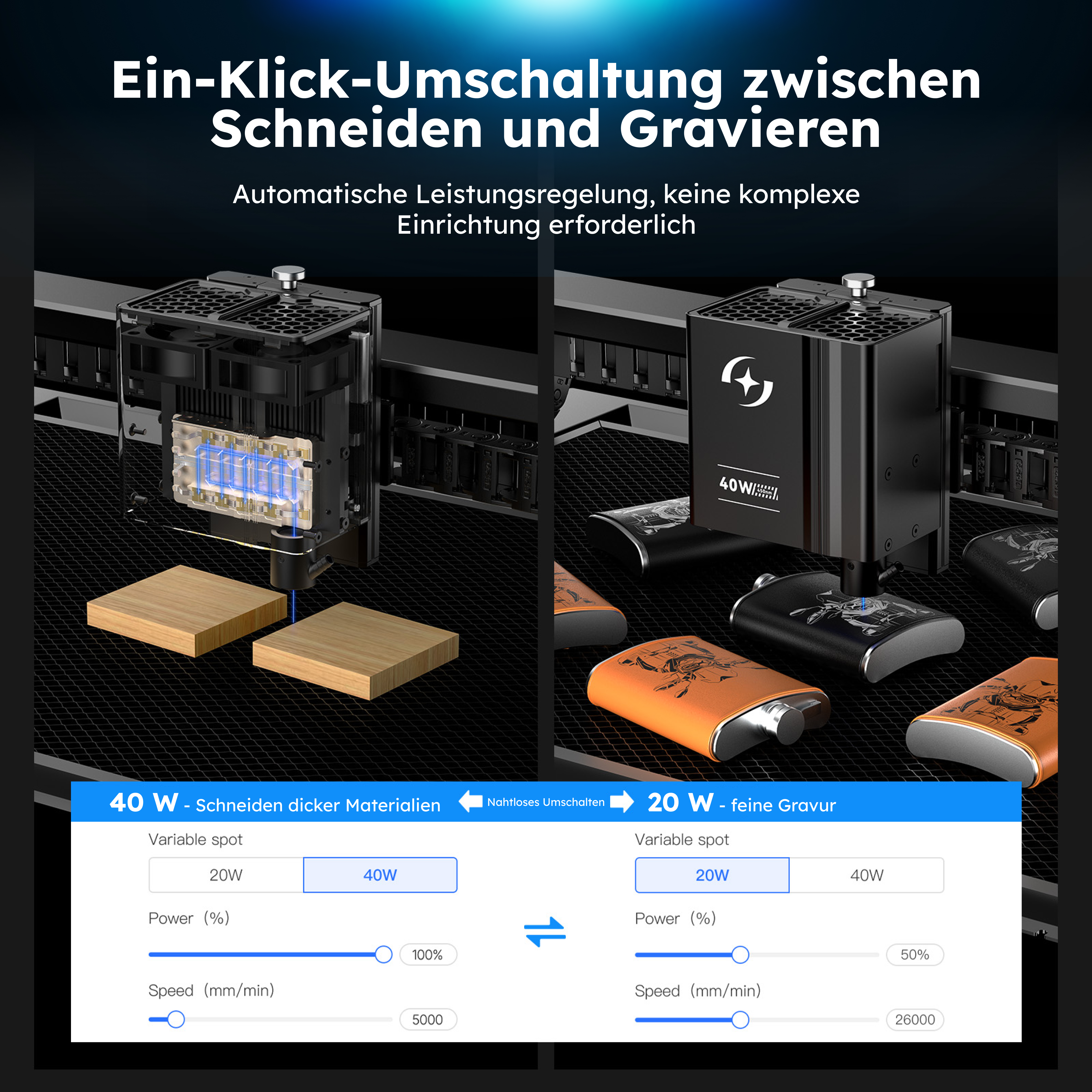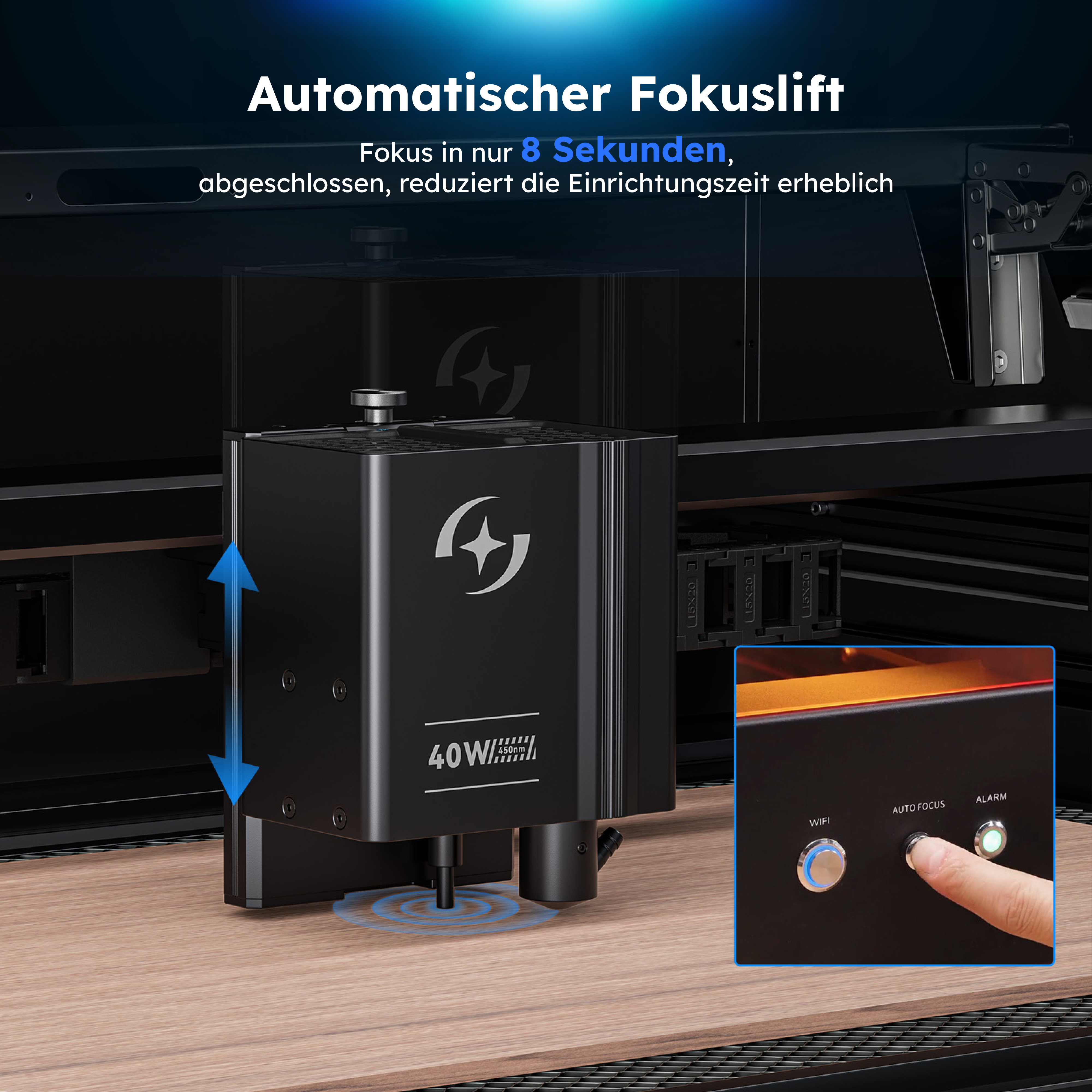 Im Mittelpunkt steht der leistungsstarke 40 W Diodenlaser, der selbst anspruchsvolle Materialien zuverlässig verarbeitet. Von Holz über Acryl bis hin zu Leder und Kunststoffen entstehen präzise Schnitte und detailreiche Gravuren in überzeugender Qualität. Auch bei stärkeren Materialien bleibt das Ergebnis sauber und gleichmäßig – ideal für Projekte, bei denen es auf Genauigkeit und ein hochwertiges Finish ankommt.