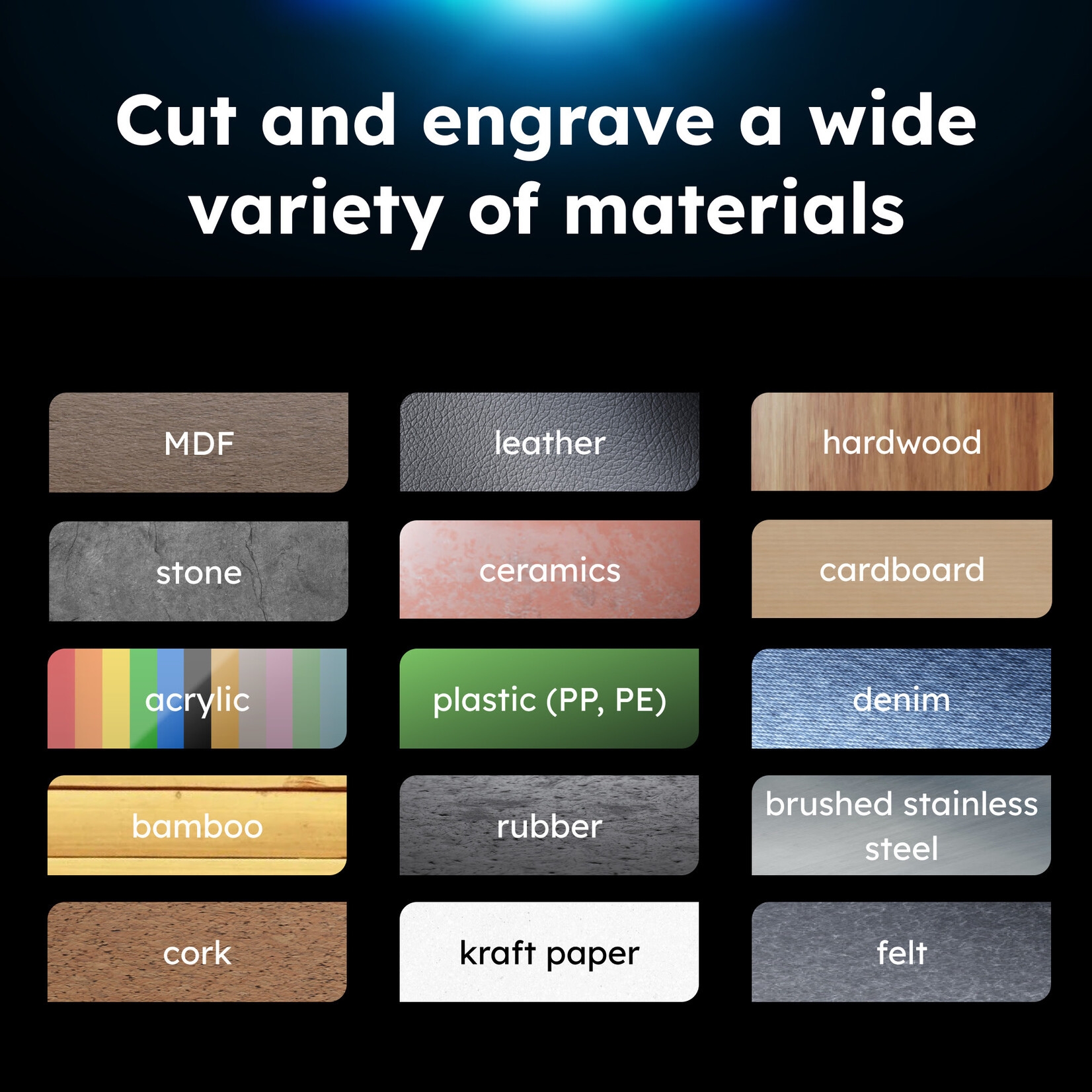 - Schneidet Holz bis 18 mm und dunkles Acryl bis 15 mm in einem Durchgang