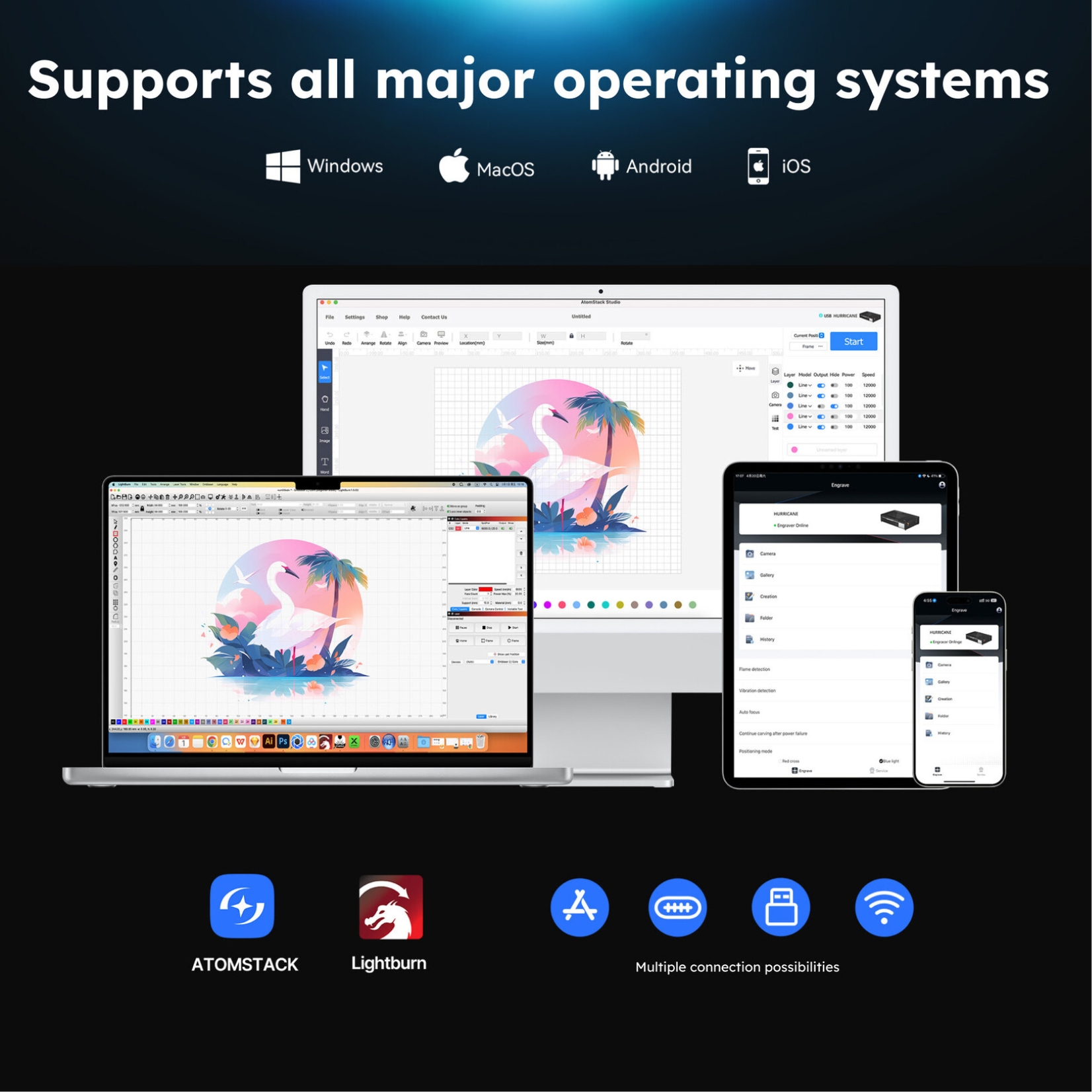 Kostenlose AtomStack Studio Software inklusive, kompatibel mit LightBurn. Unterstützt Windows, macOS, iOS und Android. Importiert DXF, JPG, PNG, BMP, SVG, GIF und weitere Formate – vollständig offline nutzbar.