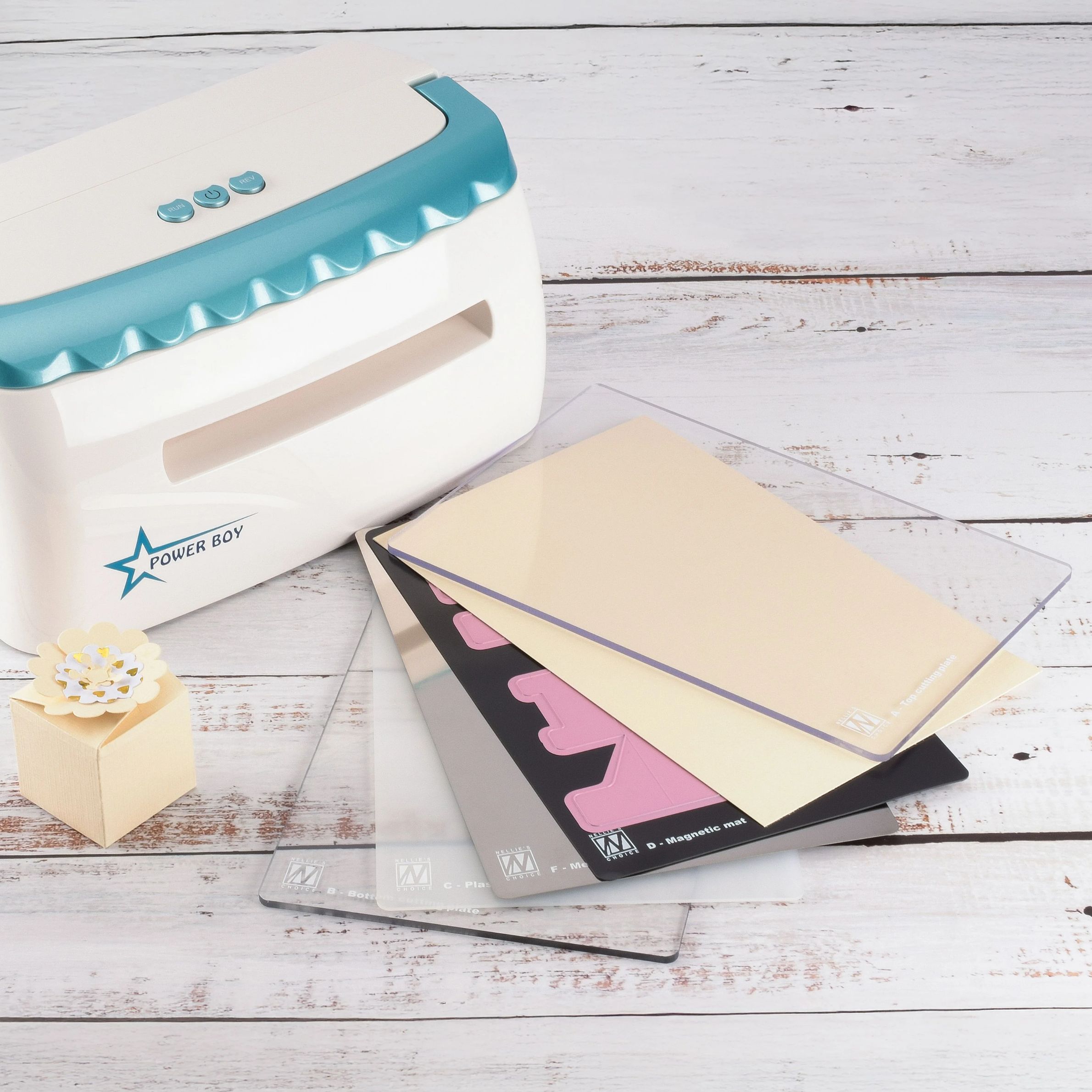 Die PowerBoy von Nellie Snellen ist eine elektrische Stanz- und Prägemaschine für alle Materialien bis zum A5-Format. Sie stanzt und prägt mühelos Papier, Tonkarton, Stoff, Schaumstoff und Filz bis zu 270 g. Mit den mitgelieferten Platten und der Prägematte lassen sich wunderschöne Ausstanzungen und Prägungen mit beliebigen Stanzschablonen oder Prägefoldern gestalten.