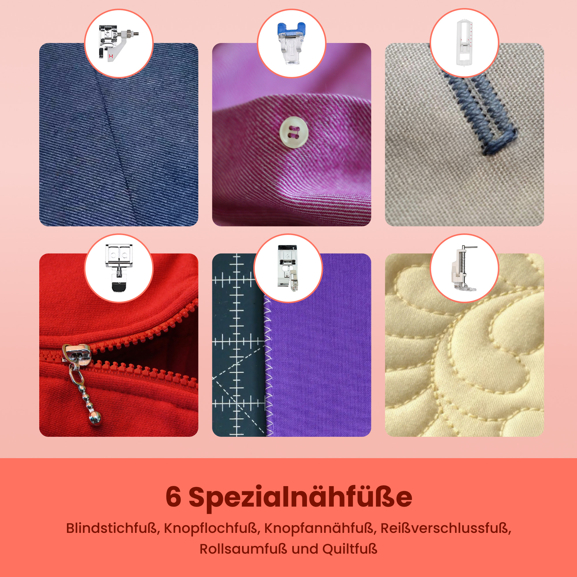 Besonders angenehm im Alltag sind die vielen Funktionen, die dir das Arbeiten erleichtern: automatischer Nadeleinfädler, Spulenaufwicklung, von oben befüllbares Greifersystem, Fadenabschneider sowie eine stufenlose Geschwindigkeitskontrolle. Zusammen mit dem gleichmäßigen Stofftransport, dem LED-Arbeitslicht und der Sicherheitsabschaltung entsteht eine Nähmaschine, die komfortabel, vielseitig und zuverlässig zugleich ist.
